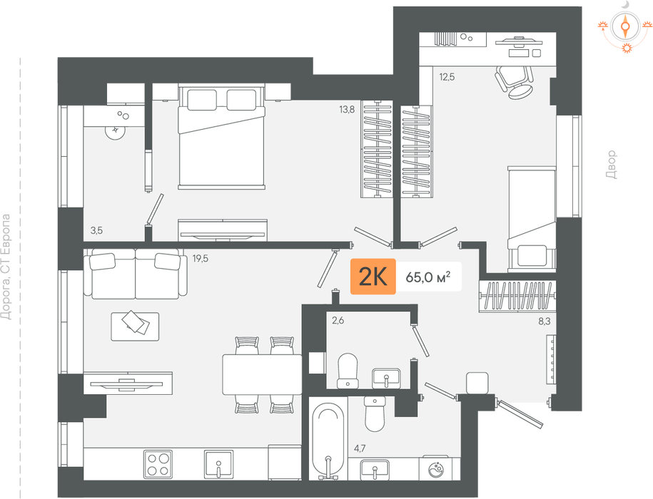 Первая очередь состоит из 4 домов по 6-8 этажей, окружающих просторный двор площадью 1 Га. Здесь размещены воркаут-комплекс, детские площадки по возрастам, стритбольная площадка, полоса препятствий, многочисленные зоны отдыха и амфитеатр под открытым небом. Парковка наземная, за пределами двора. Передача ключей — I квартал 2026 года.