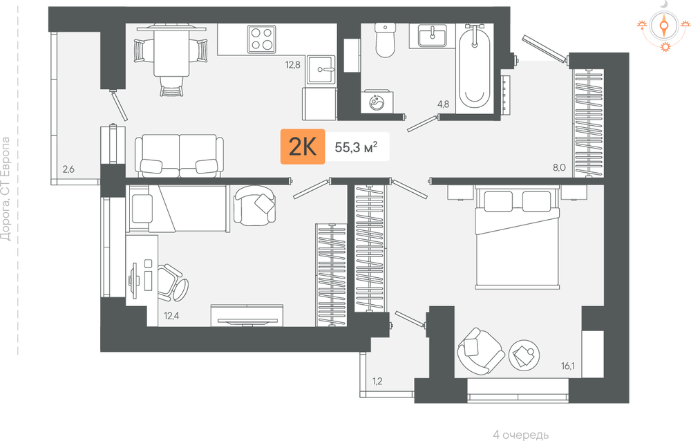 Первая очередь состоит из 4 домов по 6-8 этажей, окружающих просторный двор площадью 1 Га. Здесь размещены воркаут-комплекс, детские площадки по возрастам, стритбольная площадка, полоса препятствий, многочисленные зоны отдыха и амфитеатр под открытым небом. Парковка наземная, за пределами двора. Передача ключей — I квартал 2026 года.