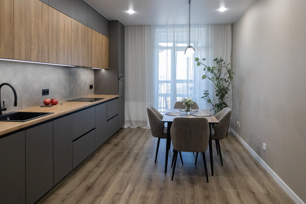 В прихожей и столовой функциональная встроенная мебель в одном стиле, выполнена на заказ под размеры помещения, встроенная подсветка, учтены все детали, чтобы по максимуму задействовать пространство. Места хватит на все и даже останется.