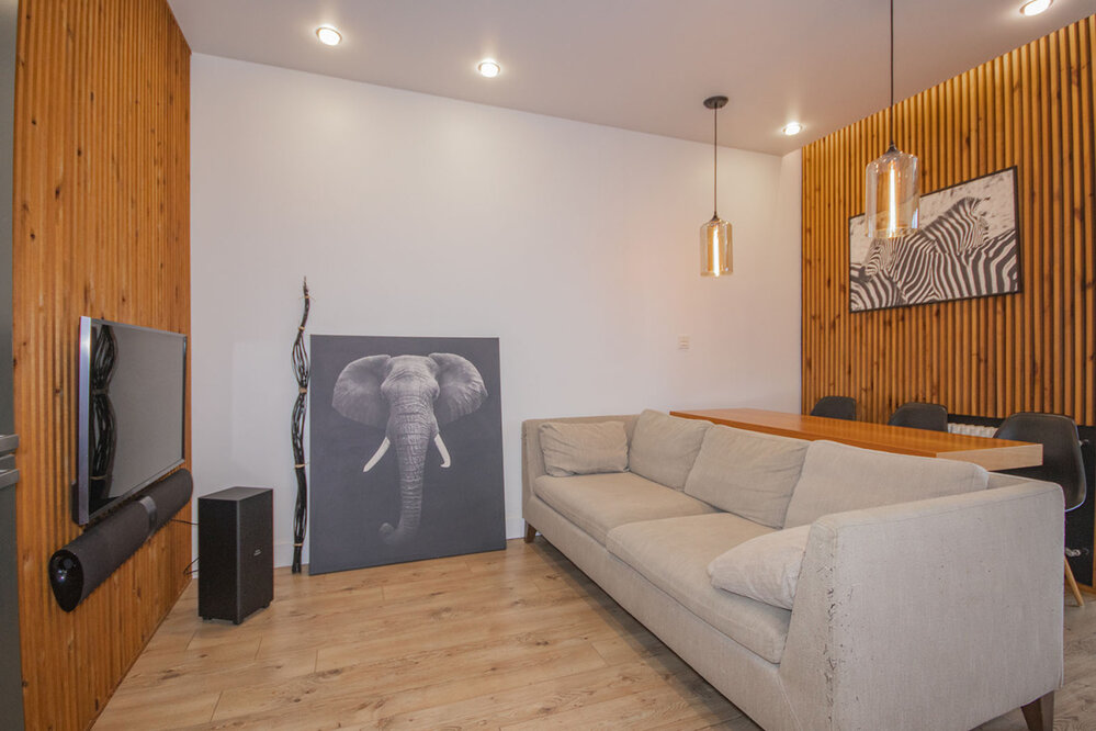Квартира очень уютная и светлая благодаря увеличенным оконным проемам, светлым тонам интерьера и большому количеству светильников .