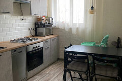В квартире остается кухонный гарнитур, с хорошей газовой варочной поверхностью и газовым духовым грилем, стиральная машина.