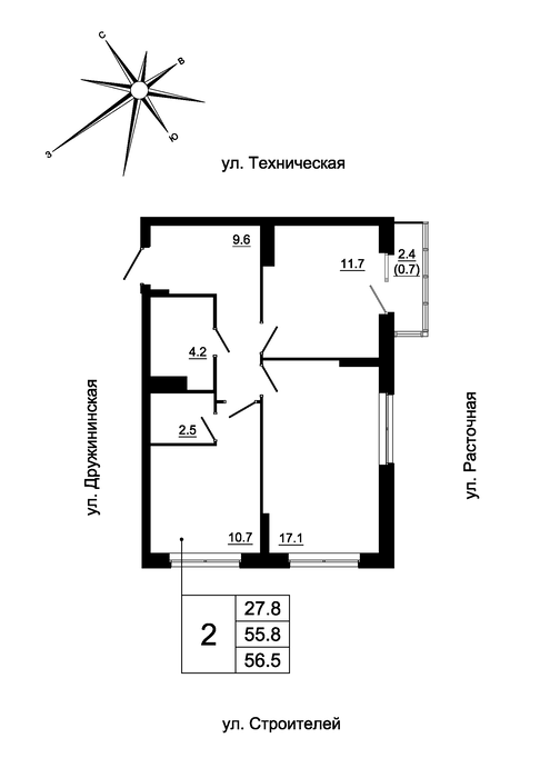 Общая площадь:56.5 м2
