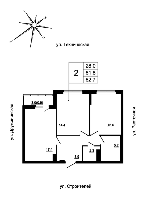 Общая площадь:60.6 м2