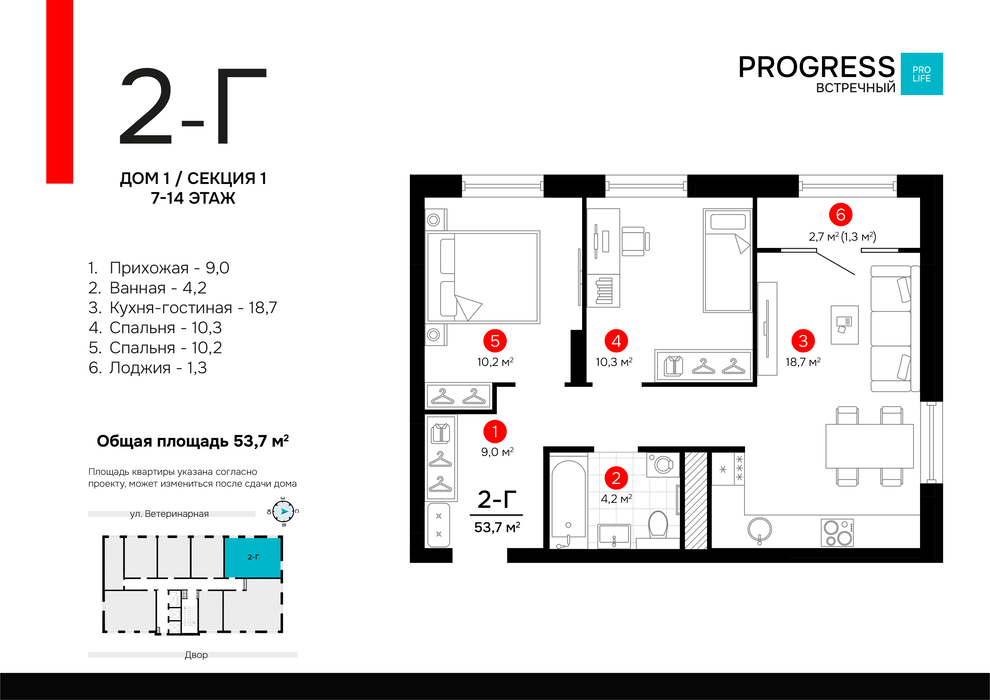 • 1-к квартира, Ветеринарная, 16/1, Жилой комплекс “PROGRESS Встречный” — 1 кв. 2026 г.