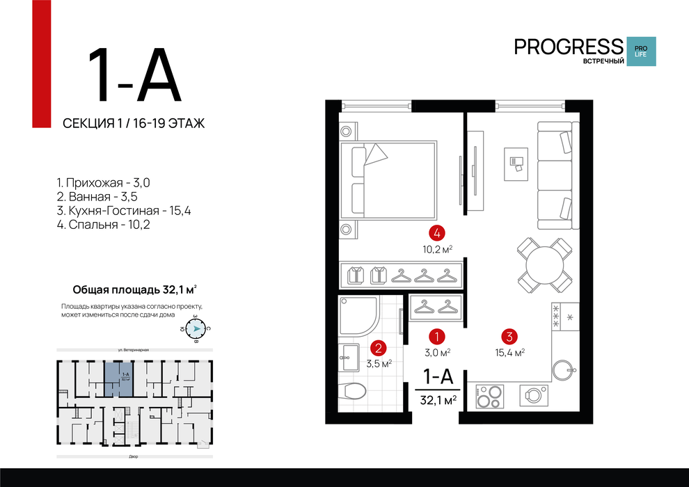• 1-к квартира, Ветеринарная, 16/1, Жилой комплекс “PROGRESS Встречный” — 1 кв. 2026 г.