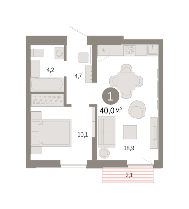 Квартира с кухней-гостиной и одной спальней в районе Шишимская горка. Особенности планировки: окна в пол, предчистовая отделка, балкон.
