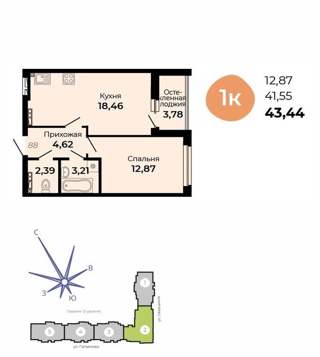 • 1-к квартира, Красноармейская, 2 этап строительства (секция1) — 2 кв. 2026 г.