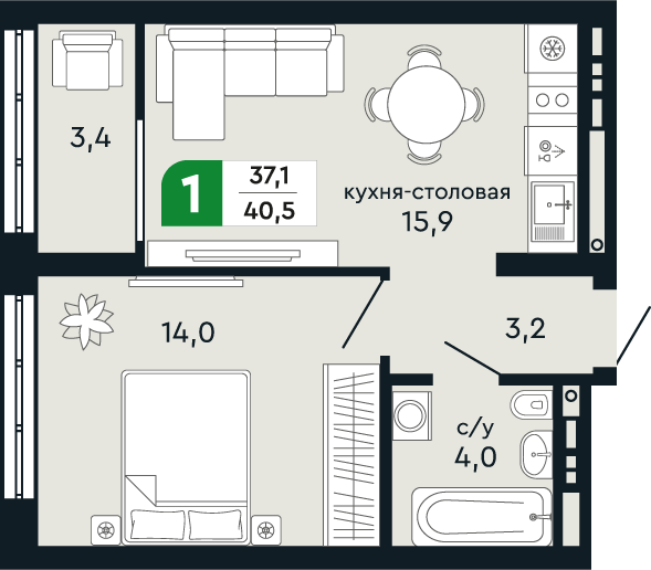 Общая площадь:40.5 м2