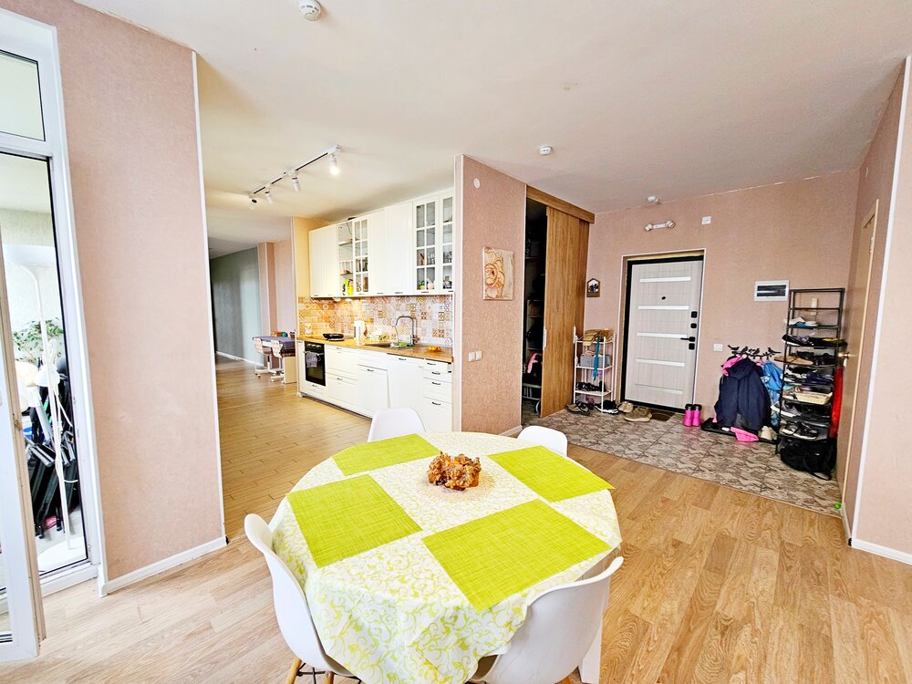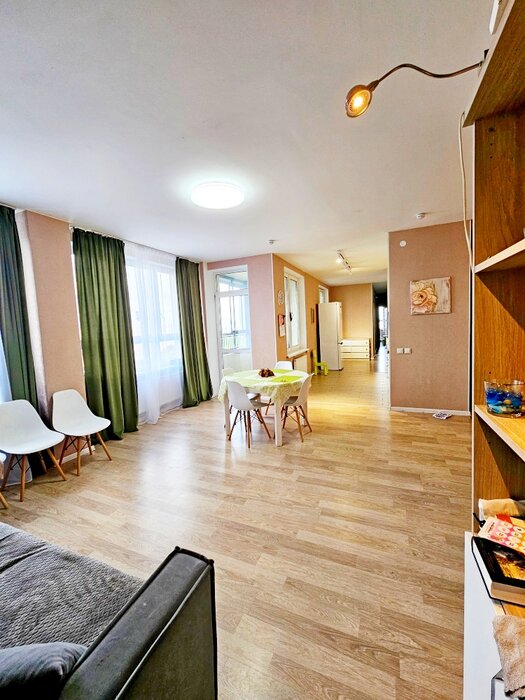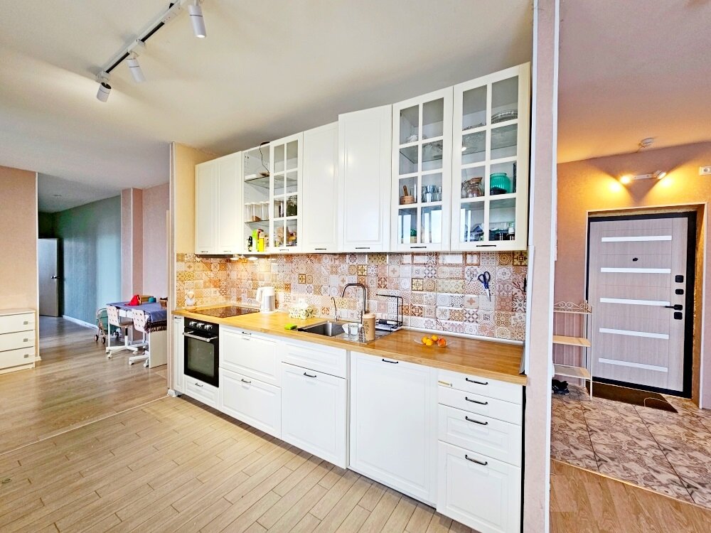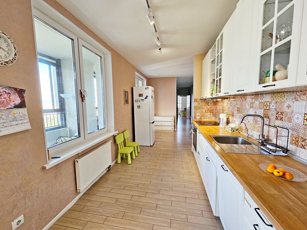 Окна выходят на две стороны. Во всей квартире выполнена шумоизоляция пола, потолка и стен, установлены межкомнатные двери из натурального дерева, 4 кондиционера. Просторная прихожая 25 м2 на полу керамогранит, смонтирована система электрический теплый пол, натяжной потолок, на стенах обои. Гостиная 28,2 м2 на полу паркет “Мербау”, гипсокартонный потолок, на стенах обои. Кухня 24 м2 на полу керамогранит, смонтирована система электрический теплый пол, на стенах обои, на потолке гипсокартонный и натяжной потолок. В комнатах 14,2 м2 и 15,4 м2 на полу паркет “Мербау”, натяжной потолок, на стенах обои. На одной из лоджий на полу паркет “Мербау”, на другой-керамическая плитка. В двух санузлах установлены биде, на полу и стенах плитка “Версаче”, смонтирована система электрический теплый пол, натяжной пололок. Установлена система очистки воды, водонагреватель, счетчики учета ГВС, ХВС, Э/Э. Новому собственнику в подарок остается кухонный гарнитур из массива дерева, тюль, встроенные шкафы-купе. Вся остальная мебель по согласованию.