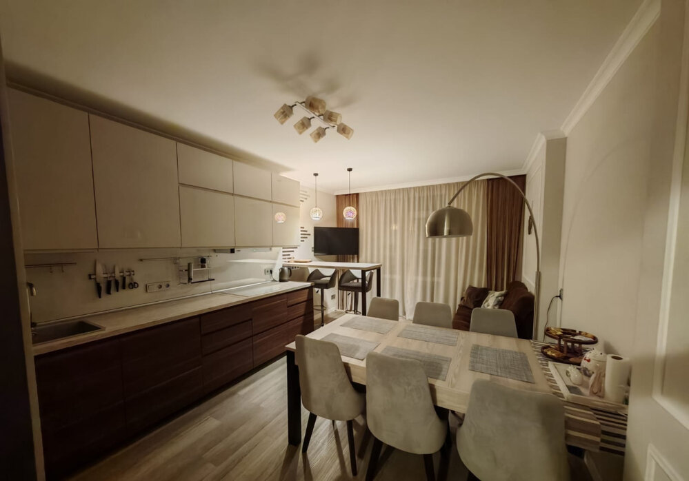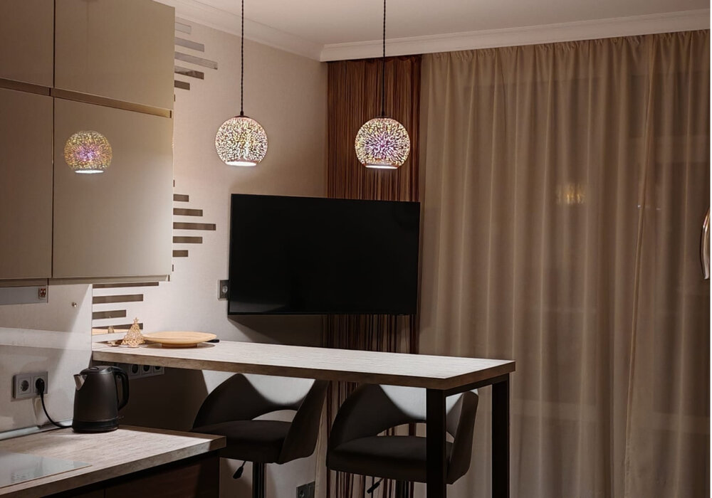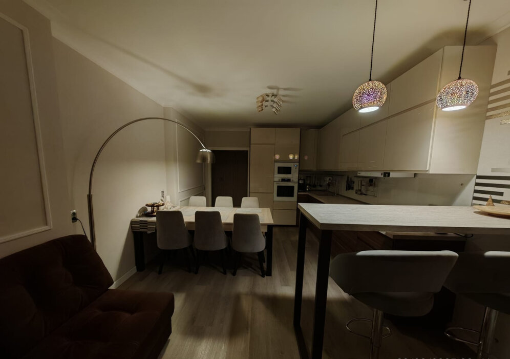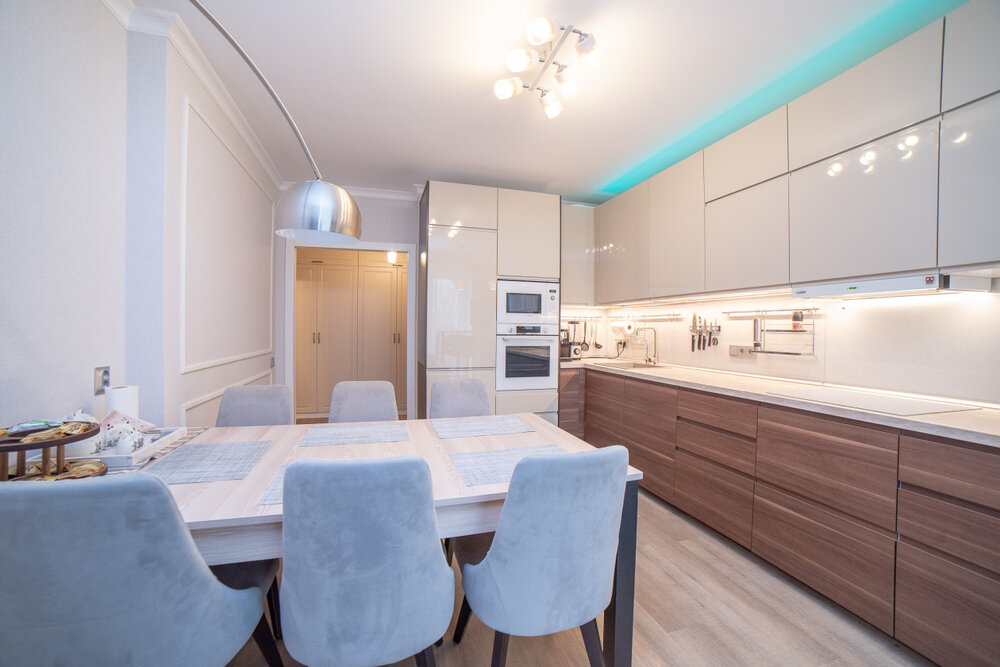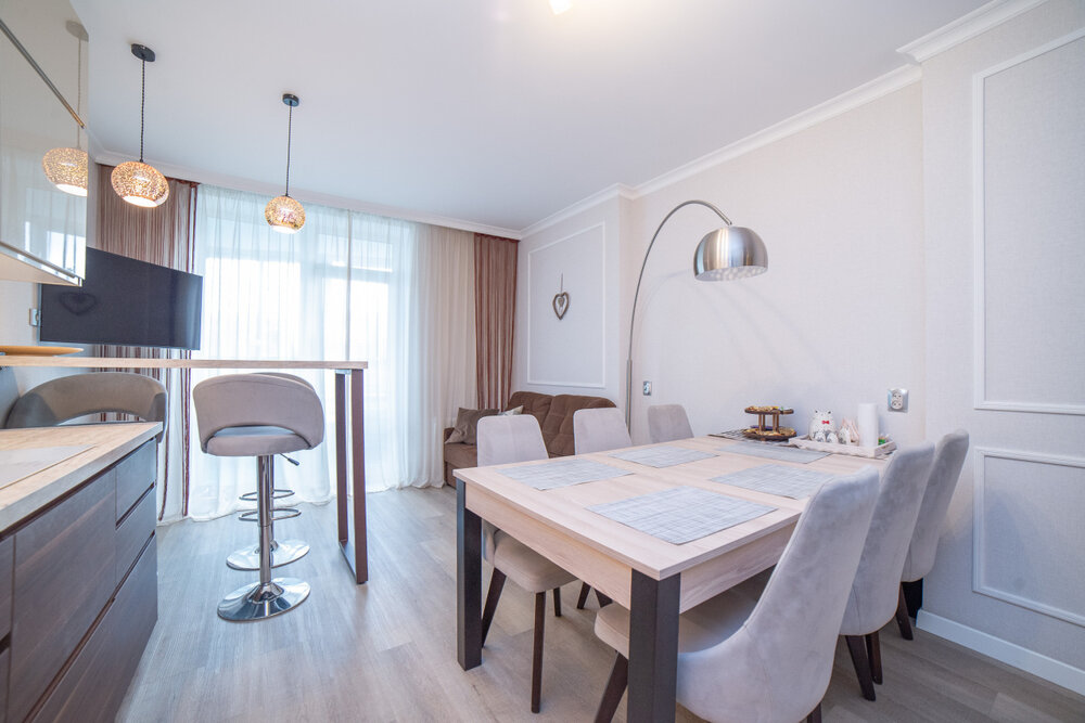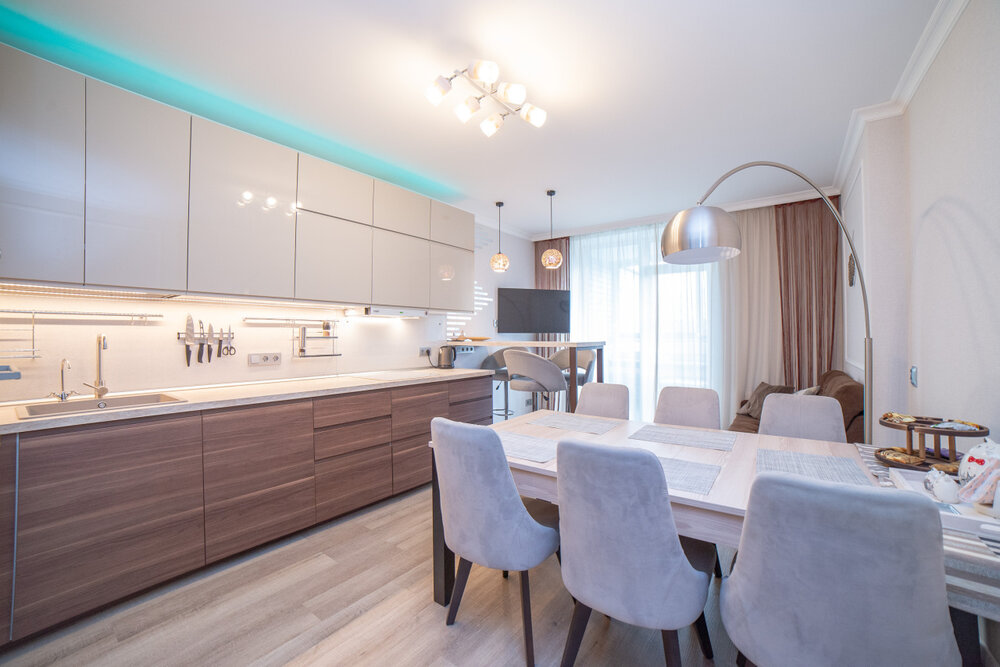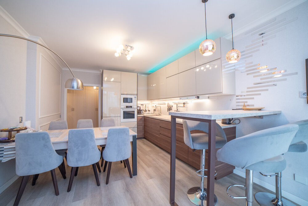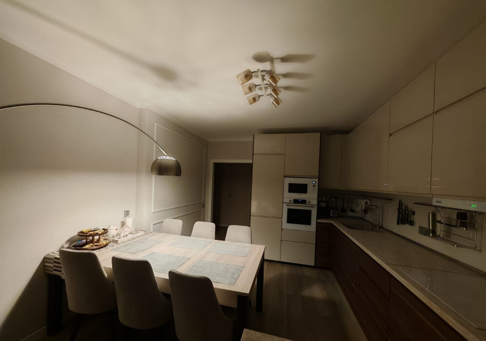 - Просторная кухня с отличным функциональным кухонным гарнитуром. Встроенная техника Electrolux – варочная поверхность, духовой шкаф, микроволновка, посудомоечная машина, холодильник, вытяжка. Раковина оборудована фильтром для питьевой воды. В зоне кухни находится стол - остров со встроенными шкафами и барными стульями.