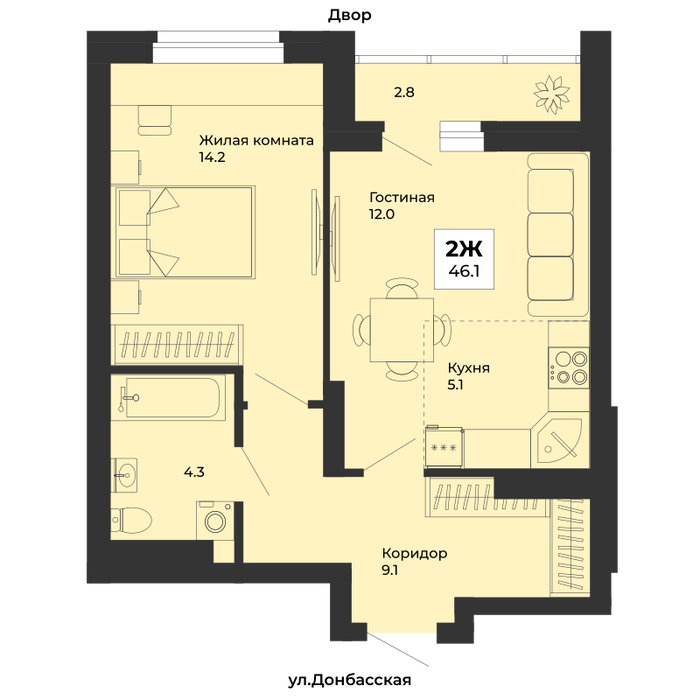 • 1-к квартира, Донбасская, 21