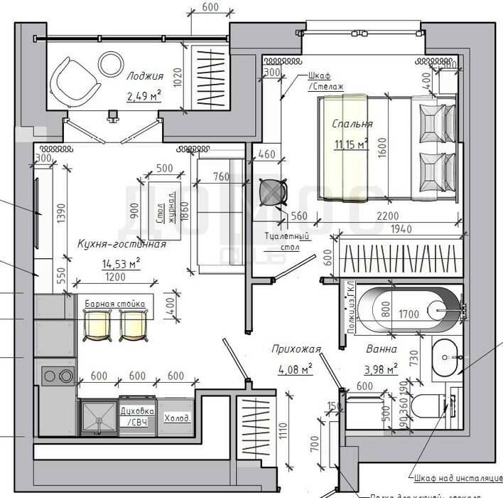 Покупателю остается: кухонный гарнитур «Lazurit» со встроенной бытовая техника (варочная поверхность и посудомоечная машина «Kuppersberg», духовой шкаф «Samsung», микроволновая печь «Вosch», вытяжка «Elica»), фильтр питьевой воды «Geizer» трех степеней очистки, два вместительных, оборудованных шкафа-купе, накопительный водонагреватель «THERMEX».