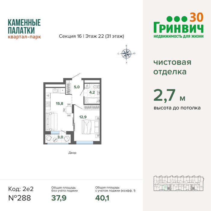 Продажа квартиры: Екатеринбург, ул. Высоцкого, ЖК "Парк Каменные палатки" (Гринвич) (Секция 16)