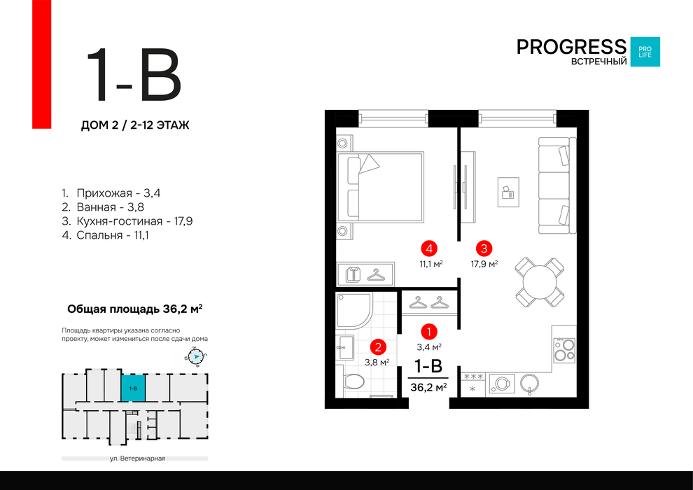 • 1-к квартира, Ветеринарная, 16/1, Жилой комплекс “PROGRESS Встречный” — 1 кв. 2026 г.
