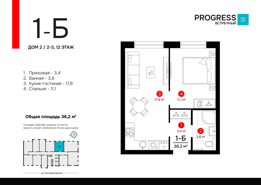 • 1-к квартира, Ветеринарная, 16/1, Жилой комплекс “PROGRESS Встречный” — 1 кв. 2026 г.