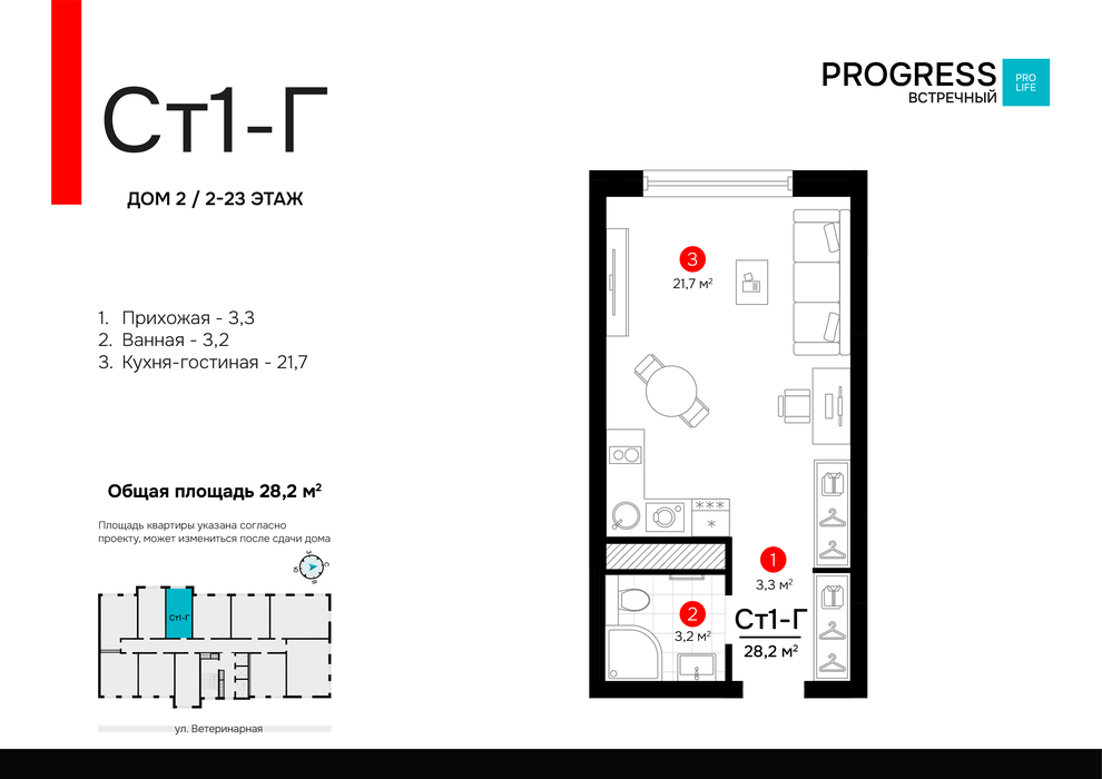 Екатеринбург, ул. Ветеринарная, 16, ЖК “PROGRESS Встречный” (Дом 1) (Юго-Западный) - фото квартиры 21 января 2026 90 дн. 1 33 13/25 5 490 000
