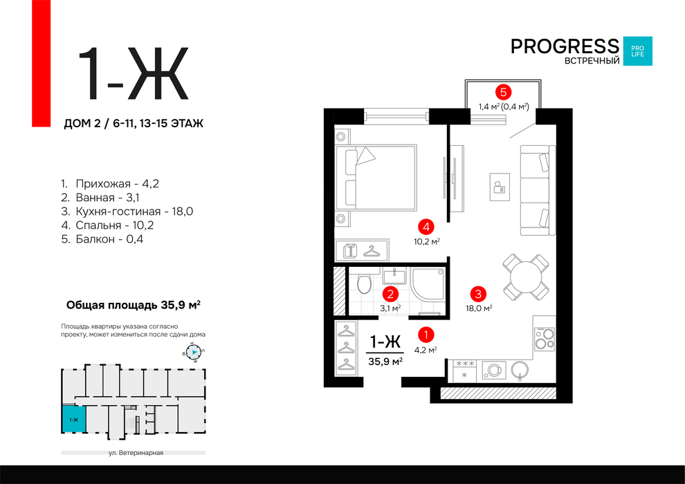 • 1-к квартира, Ветеринарная, 16/1, Жилой комплекс “PROGRESS Встречный” — 1 кв. 2026 г.