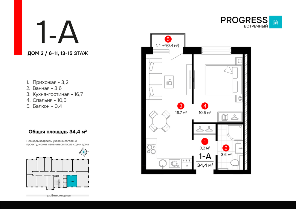 • 1-к квартира, Ветеринарная, 16/1, Жилой комплекс “PROGRESS Встречный” — 1 кв. 2026 г.