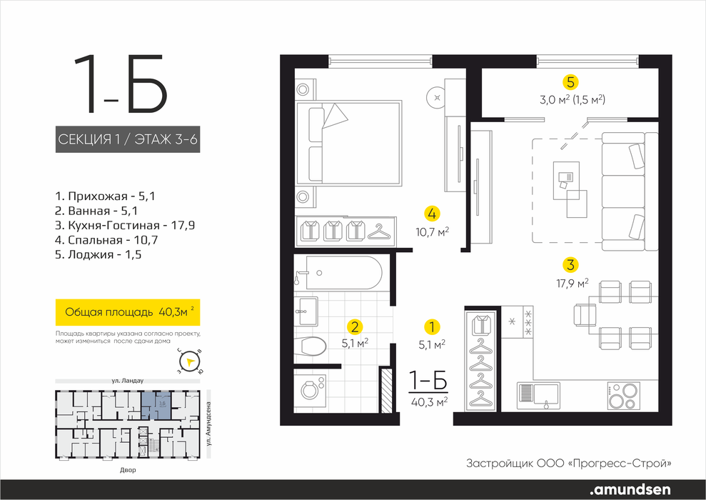 Екатеринбург, ул. Ландау, 3, ЖК «Amundsen» (Амундсен) (Ландау, 3) - фото квартиры 26 апреля 2025 90 дн. 1 33 7/25 5 500 000