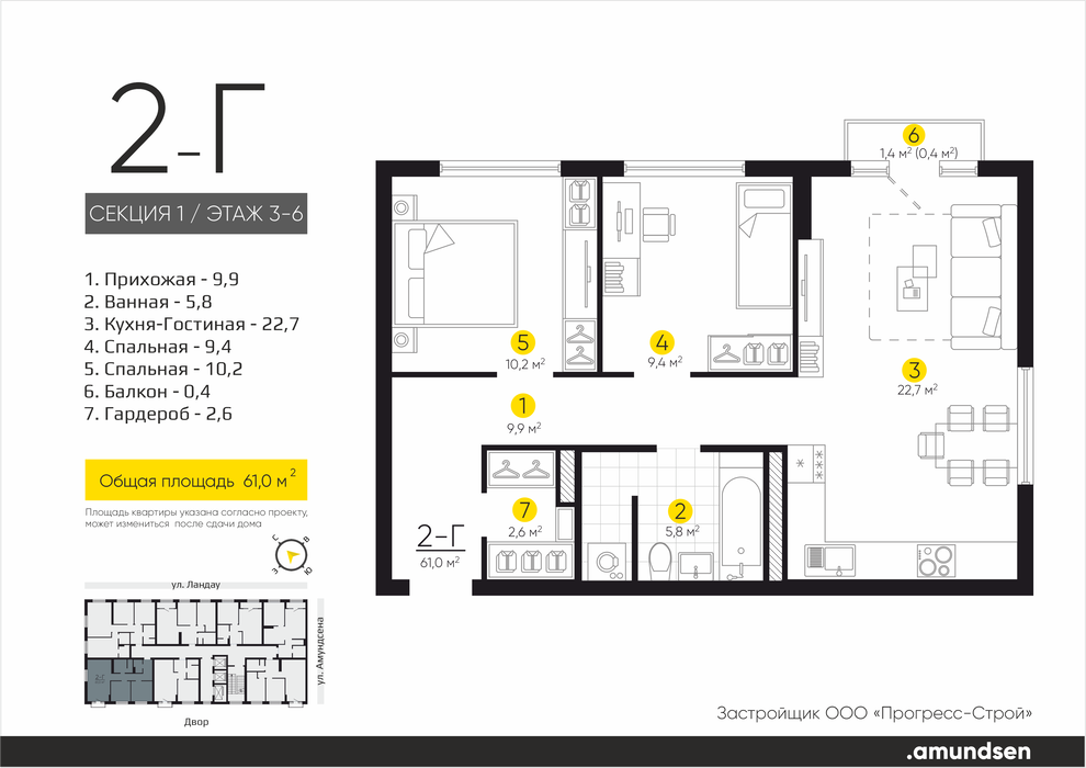 Екатеринбург, ул. Ландау, 3, ЖК «Amundsen» (Амундсен) (Ландау, 3) - фото квартиры 27 декабря 2024 90 дн. 2 62 6/24 9 500 000