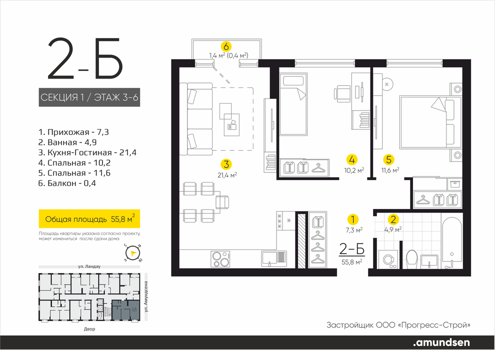 Екатеринбург, ул. Ландау, 1, ЖК «Amundsen» (Амундсен) (Дом 1) (Академический) - фото квартиры 10 января 2024 90 дн. 2 55 9/18 7 750 000