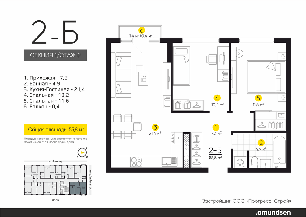 Екатеринбург, ул. Ландау, 3, ЖК «Amundsen» (Амундсен) (Ландау, 3) - фото квартиры 26 апреля 2025 90 дн. 1 33 7/25 5 500 000