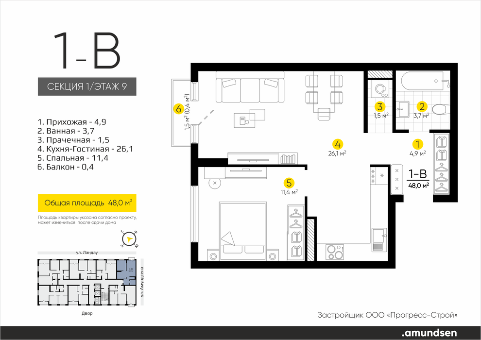 Екатеринбург, ул. Ландау, 3, ЖК «Amundsen» (Амундсен) (Ландау, 3) - фото квартиры 26 апреля 2025 90 дн. 1 33 7/25 5 500 000