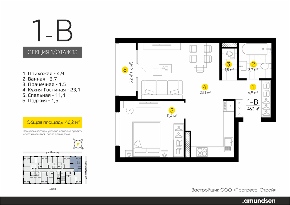 Екатеринбург, ул. Академика Ландау, 3, ЖК «Amundsen» (Амундсен) (Ландау, 3) (Академический) - фото квартиры 24 апреля 2025 90 дн. 1 23.13 10/24 4 600 000