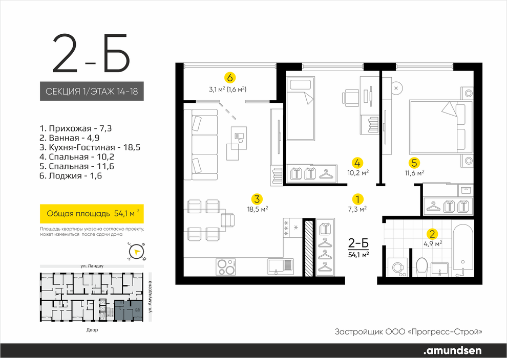 Екатеринбург, ул. Ландау, 1, ЖК «Amundsen» (Амундсен) (Дом 1) (Академический) - фото квартиры 10 января 2024 90 дн. 2 55 9/18 7 750 000
