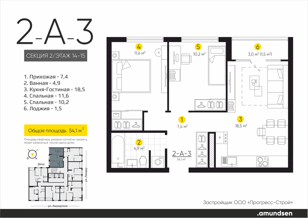 Екатеринбург, ул. Ландау, 1, ЖК «Amundsen» (Амундсен) (Дом 1) (Академический) - фото квартиры 10 января 2024 90 дн. 2 55 9/18 7 750 000