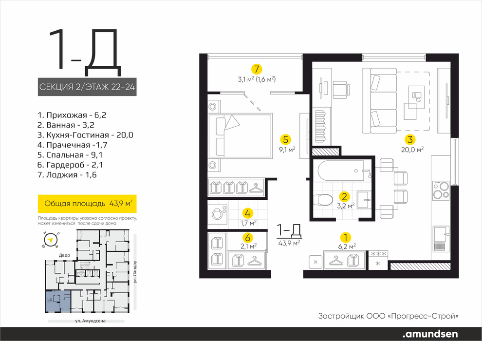 Екатеринбург, ул. Ландау, 3, ЖК «Amundsen» (Амундсен) (Ландау, 3) - фото квартиры 26 апреля 2025 90 дн. 1 33 7/25 5 500 000