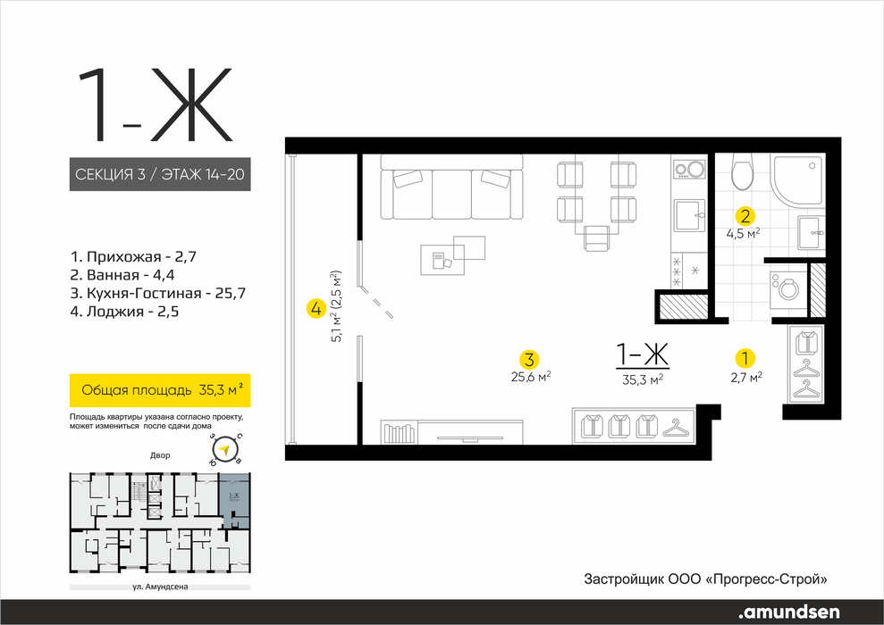 Екатеринбург, ул. Ландау, 3, ЖК «Amundsen» (Амундсен) (Ландау, 3) - фото квартиры 26 апреля 2025 90 дн. 1 33 7/25 5 500 000