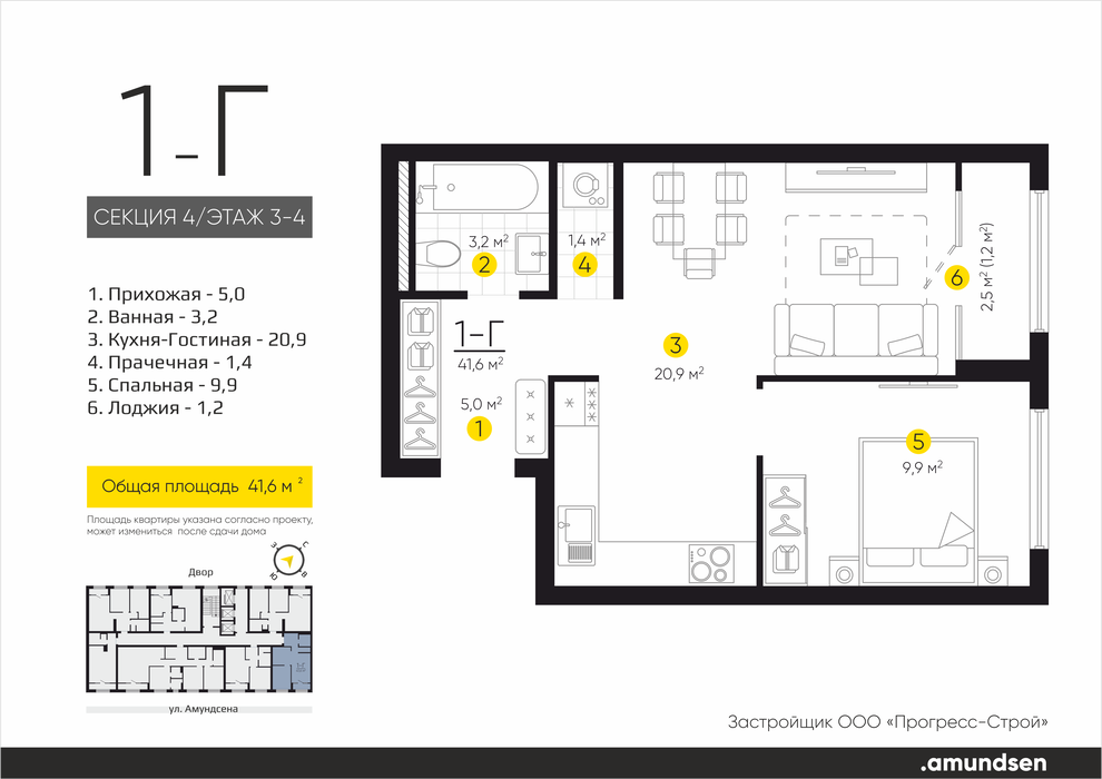 Кухня-гостиная 20,2 кв., спальня 11,8 кв.м, санузел 5 кв.м., гардеробная 1,8 кв.м, балкон 3,6 кв.м.