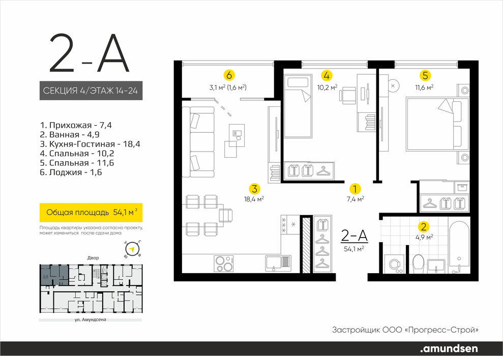Екатеринбург, ул. Ландау, 1, ЖК «Amundsen» (Амундсен) (Дом 1) (Академический) - фото квартиры 10 января 2024 90 дн. 2 55 9/18 7 750 000