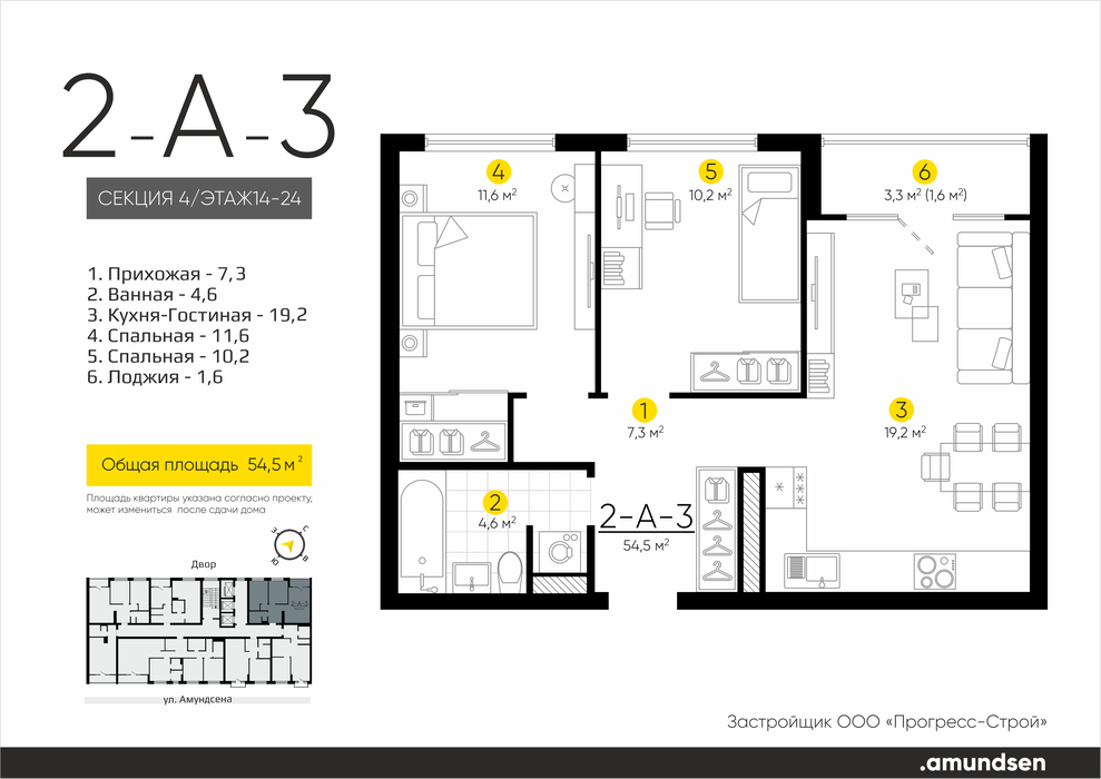 Екатеринбург, ул. Ландау, 1, ЖК «Amundsen» (Амундсен) (Дом 1) (Академический) - фото квартиры 10 января 2024 90 дн. 2 55 9/18 7 750 000