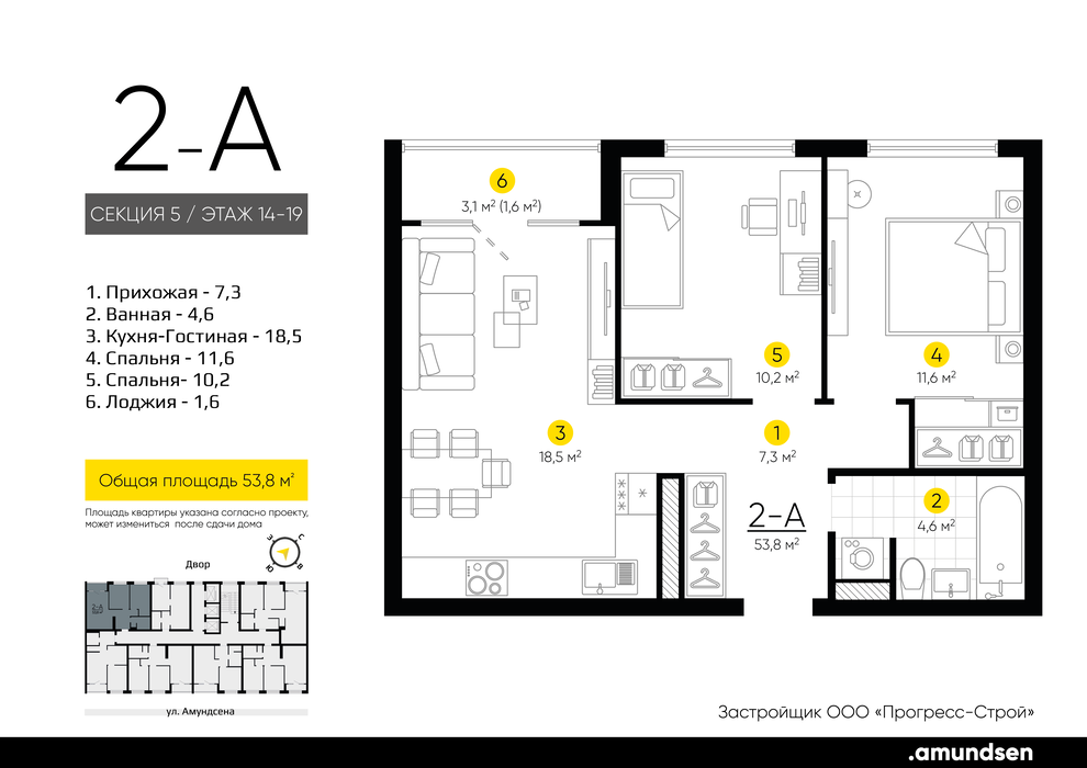 Екатеринбург, ул. Ландау, 1, ЖК «Amundsen» (Амундсен) (Дом 1) (Академический) - фото квартиры 10 января 2024 90 дн. 2 55 9/18 7 750 000