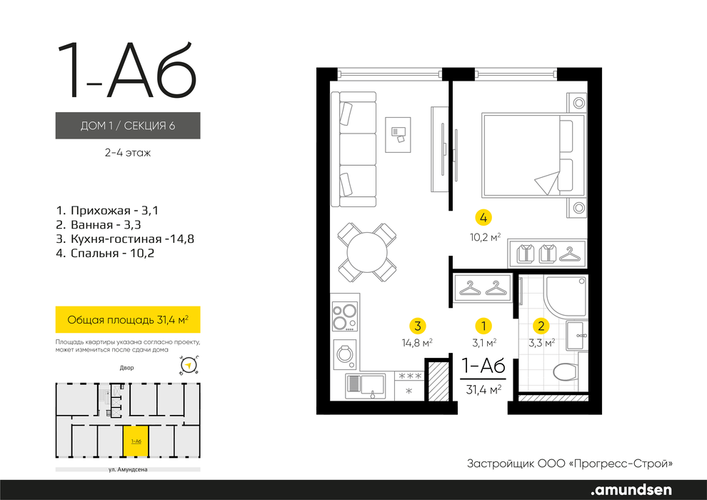 1-к квартира, Ландау, 2, Жилой квартал «Amundsen» (Амундсен) — 1 кв. 2026 г.