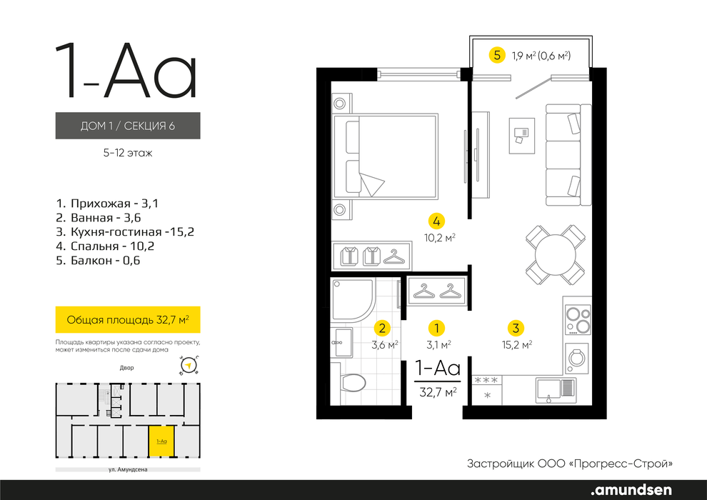 1-к квартира, Ландау, 2, Жилой квартал «Amundsen» (Амундсен) — 1 кв. 2026 г.