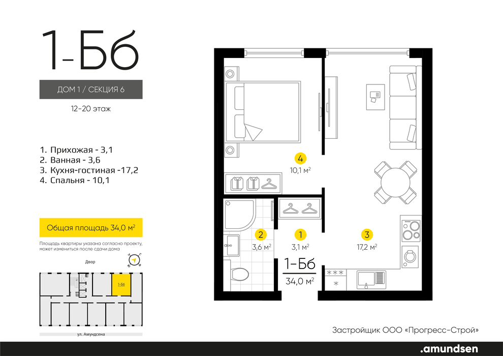 1-к квартира, Победы, 5б, 34, ЖК "Уют Сити" — 3 кв. 2025 г.