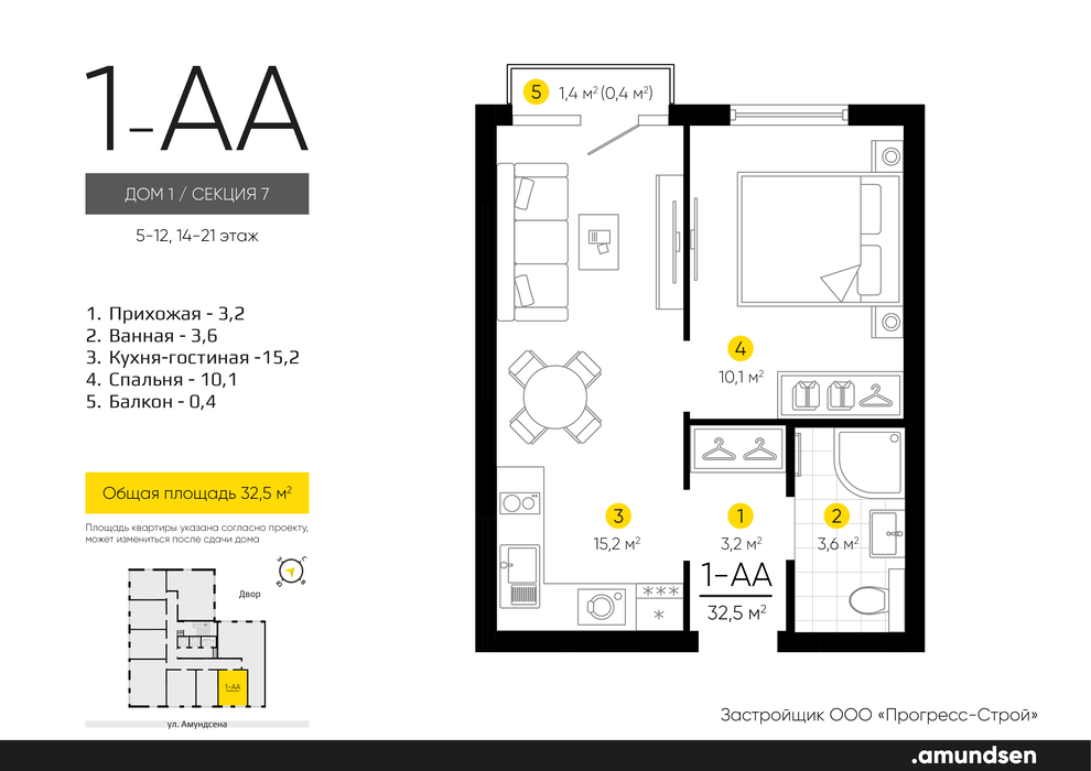 1-к квартира, Ландау, 2, Жилой квартал «Amundsen» (Амундсен) — 1 кв. 2026 г.