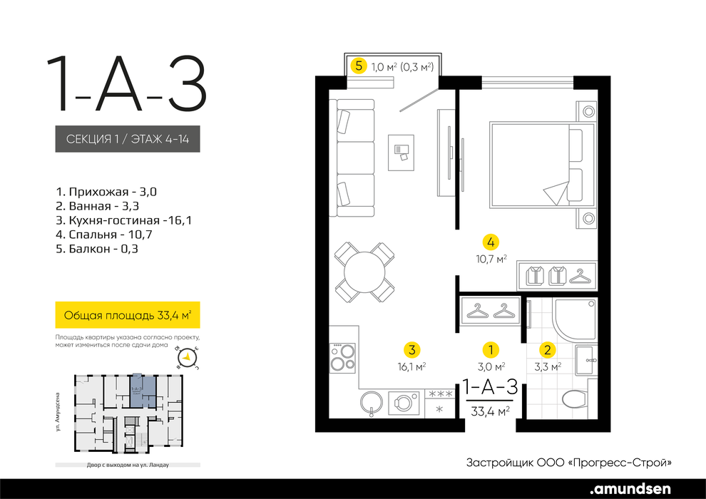 Кухня-гостиная 20,2 кв., спальня 11,8 кв.м, санузел 5 кв.м., гардеробная 1,8 кв.м, балкон 3,6 кв.м.
