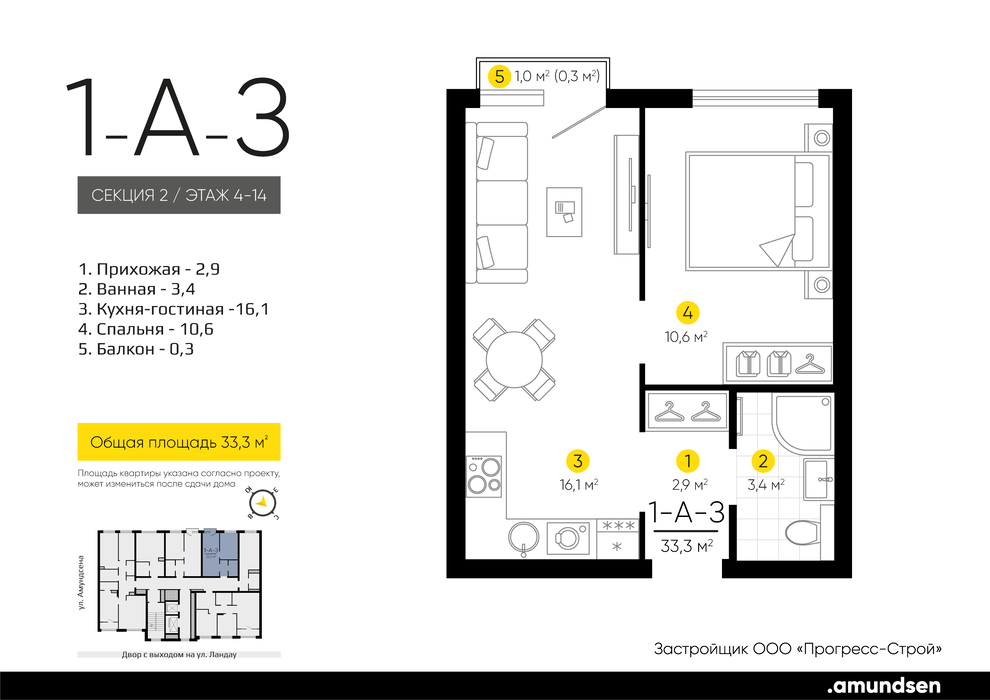 Екатеринбург, ул. Ландау, 3, ЖК «Amundsen» (Амундсен) (Ландау, 3) - фото квартиры 26 апреля 2025 90 дн. 1 33 7/25 5 500 000