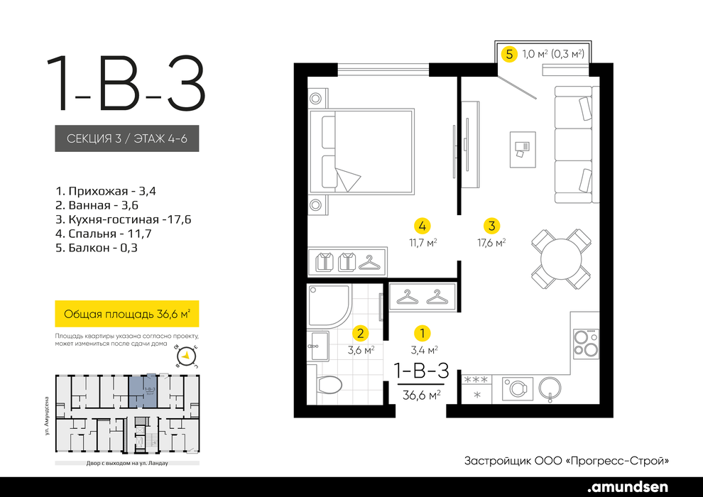 1-к квартира, Ландау, 2, Жилой квартал «Amundsen» (Амундсен) — 1 кв. 2026 г.