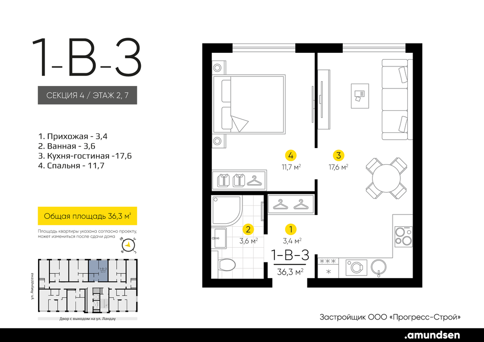 1-к квартира, Ландау, 2, Жилой квартал «Amundsen» (Амундсен) — 1 кв. 2026 г.