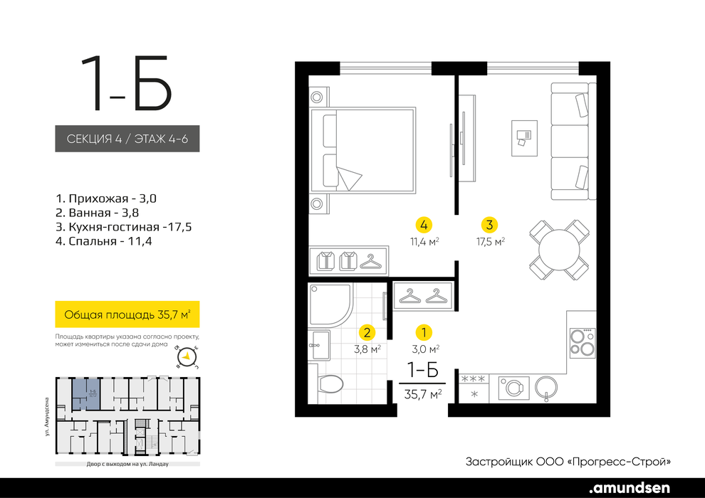 1-к квартира, Ландау, 2, Жилой квартал «Amundsen» (Амундсен) — 1 кв. 2026 г.