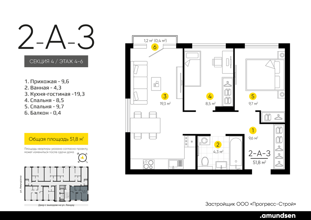 Екатеринбург, ул. Ландау, 1, ЖК «Amundsen» (Амундсен) (Дом 1) (Академический) - фото квартиры 10 января 2024 90 дн. 2 55 9/18 7 750 000