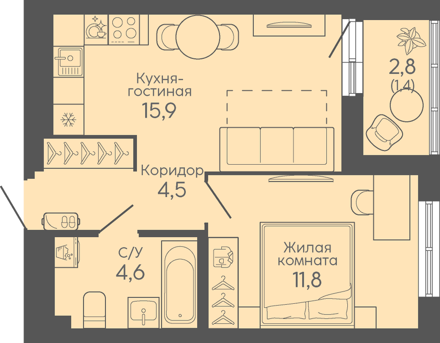 Екатеринбург, ул. Новосинарский, ЖК «Новокольцовский» (Дом №4) (Птицефабрика) - фото квартиры 4 сентября 2024 90 дн. 1 32.3 6/15 4 600 000