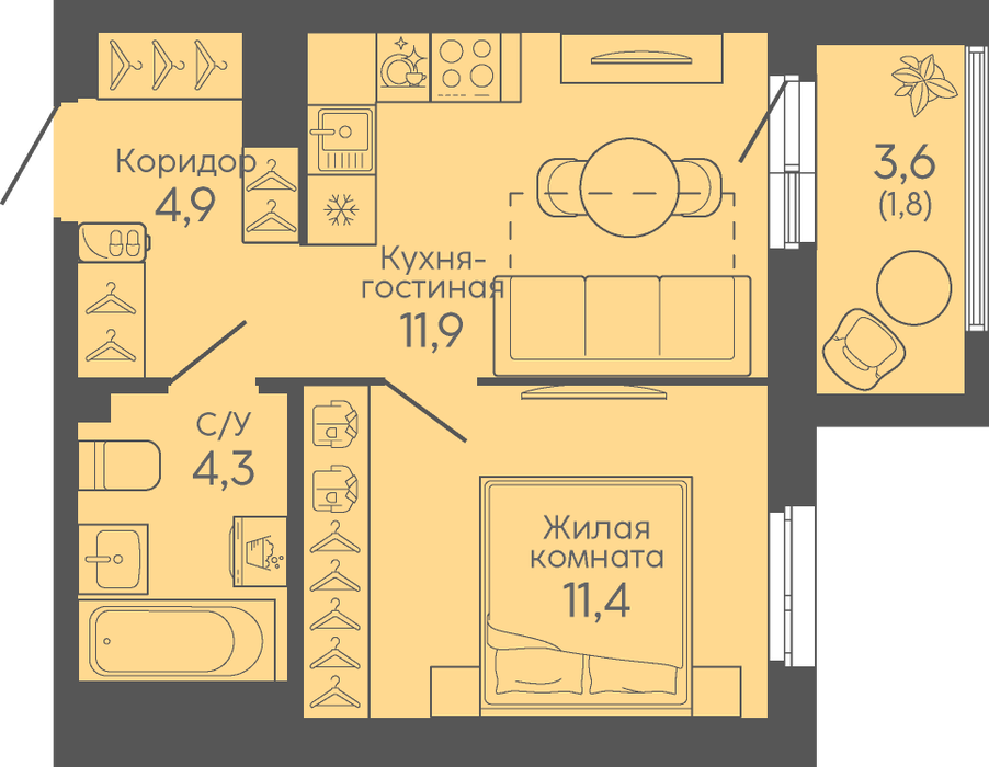 Общая площадь:34.6 м2