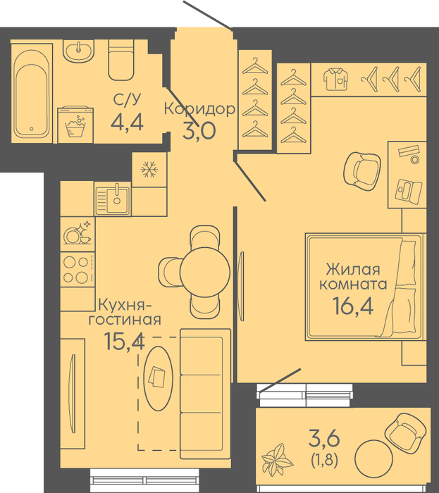 Общая площадь:41.3 м2