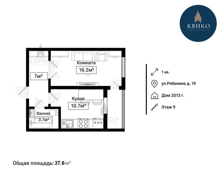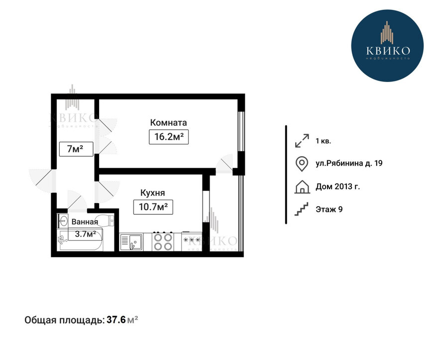 • 1-комнатная квартира: общая площадь — 37,6 м², кухня — 10,7 м², просторная комната — 16,2 м² и коридор 7 м², с/у - 3,7 м²